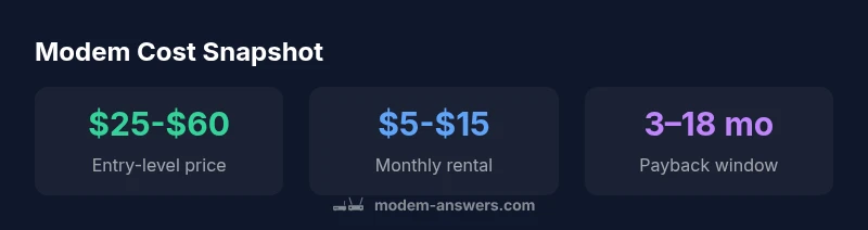 According to Modem Answers, the cost of a modem typically ranges from $25 to $120 for consumer devices, with rental options often bundled by ISPs. For homeowners evaluating long-term costs in 2026, consider purchase price, rental fees, and required equipment features. This quick snapshot helps frame the total cost of a modem over its lifespan.