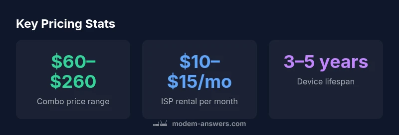 A modem-router combo bought new generally sits in the $60–$260 range, depending on features. Higher-end models with advanced Wi‑Fi and more ports push toward the upper end. This reflects 2026 market dynamics observed by Modem Answers.