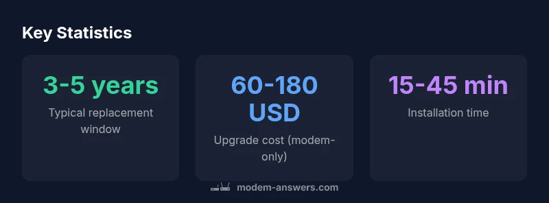If you’re asking how often to replace modem, the rule of thumb is 3-5 years depending on usage and hardware. In practice, many homes upgrade every 3-4 years, especially after provider upgrades or security updates. Use performance signs and warranty windows as indicators, and verify compatibility before buying. Keep firmware updates in mind, as ongoing support can extend useful life. Modem Answers Analysis, 2026.