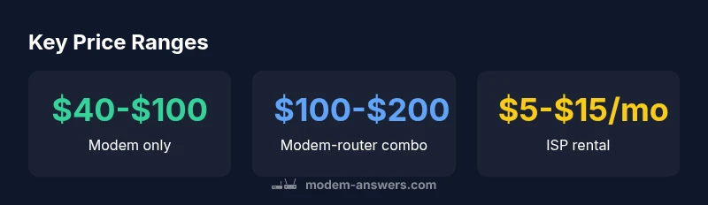 Prices for standalone modems typically range from $40 to $100, with more capable or Wi‑Fi enabled models climbing to $100–$200. ISP rentals commonly run $5–$15 per month, and bundles can push costs higher. Over 2–3 years, buying outright usually saves money compared with renting, especially if you upgrade your plan or device. According to Modem Answers Analysis, 2026, price bands largely reflect features, DOCSIS standard, and compatibility with providers.
