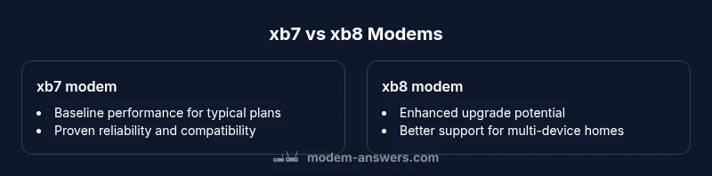 According to Modem Answers, the xb7 modem vs xb8 decision hinges on upgrade readiness and home needs. The xb8 typically offers a smoother upgrade path with longer firmware support and better handling of larger networks, while the xb7 provides reliable, cost-conscious performance for smaller households and mid-tier plans. Choose xb8 for future-proofing; xb7 for budget-focused setups.