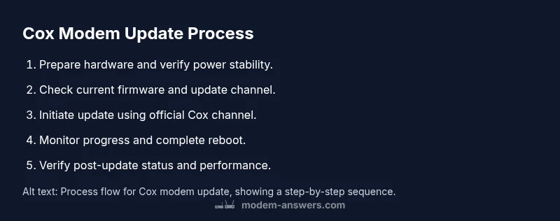 To update a Cox modem, you’ll ensure the device is connected, backed up if recommended, and updated through Cox's official steps. This guide covers checking current firmware, performing a safe update, and verifying the connection afterward. According to Modem Answers, a timely cox modem update improves security and reliability, with minimal downtime when using a wired Ethernet link.