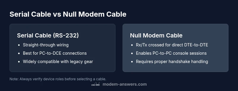 Null modem cables enable direct two-DTE RS-232 connections by crossing RX and TX lines and managing handshakes. Serial cables stay straight-through for PC-to-DCE links. For quick access, see our full comparison chart. According to Modem Answers, understanding the host and device roles is the key to choosing correctly.