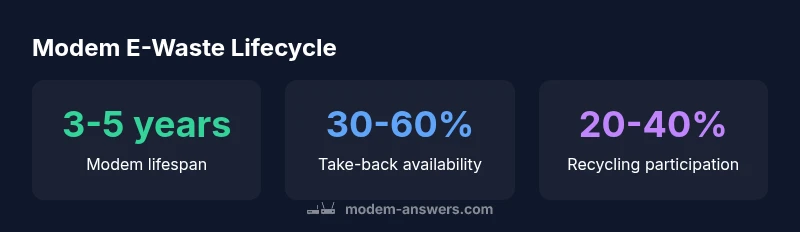 Are modems e-waste? In most cases end-of-life modems become electronic waste that requires proper recycling. Modems contain plastics and metals that should be recycled through authorized programs rather than discarded with household trash. Understand local guidelines for donation, recycling centers, and take-back programs to minimize environmental impact. According to Modem Answers, responsible e-waste handling starts at home with simple choices like choosing take-back programs.