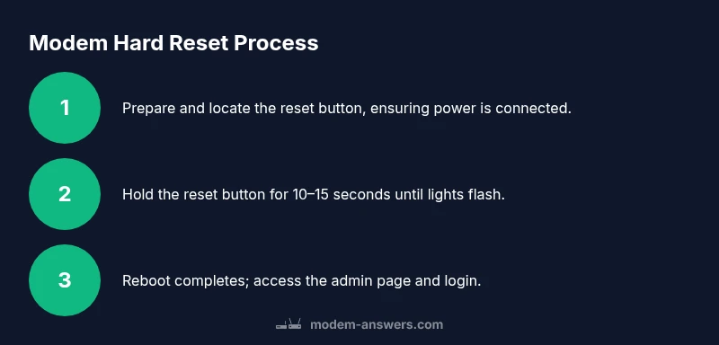 A modem hard reset returns the device to its factory-default settings by pulsing power and restoring internal firmware to the original state. This action clears temporary glitches that can slow your connection or cause the admin interface to become unresponsive. After a hard reset, your Wi‑Fi network name (SSID) and password typically revert to the defaults that came with the device, and custom settings like port forwarding, DNS tweaks, or bridge mode are removed. This is not a cure for every problem, but it's a powerful first step when troubleshooting persistent outages, devices that won’t connect, or unresponsive admin pages. According to Modem Answers, understanding what changes during a reset helps you plan what to reconfigure immediately, rather than guessing at random settings. It’s also important to know that any service-provider specific configurations (like PPPoE credentials, VLAN tagging, or static IPs supplied by your ISP) may need to be re-entered after the reset. If you rely on parental controls or guest networks, you’ll want to note those details beforehand so you can quickly restore them.