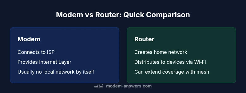 According to Modem Answers, understanding the difference between a modem and a router starts with recognizing their distinct roles in your home network. The modem links your residence to your internet service provider by translating signals between the provider and your home devices. The router, meanwhile, builds the local network inside your home, assigns IP addresses, and directs traffic between devices and the internet. The phrase difference between a modem and a has often been asked in various phrasings, but the core idea remains the same: one device serves as the bridge to the internet, while the other creates the inside of your network. In this opening section we set the stage by highlighting why that separation matters for speed, reliability, and future flexibility.