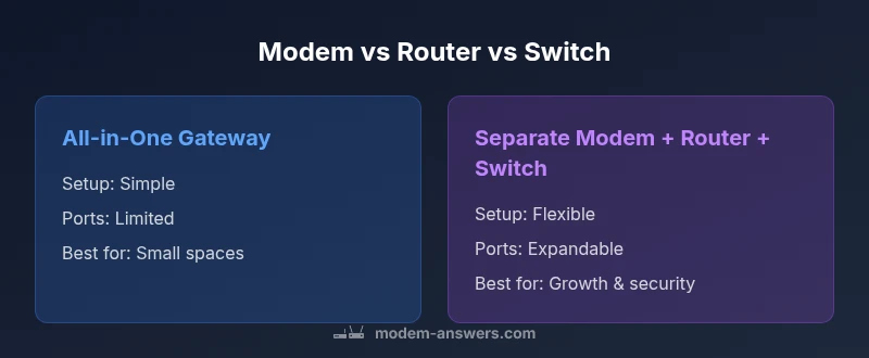 Explore the difference between a modem, router, and switch with practical guidance for home networks. Learn when to combine devices or deploy separate hardware for speed, security, and scalability.