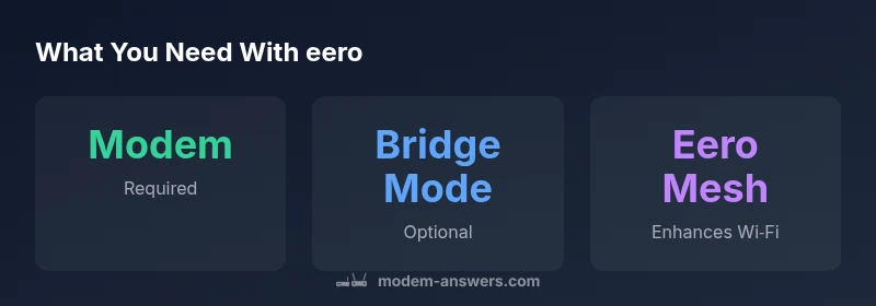 The question does eero need a modem is a common one among homeowners planning a home network. In essence, a modem is the device that converts your internet service into a usable data signal over Ethernet, while a router (and a mesh system like eero) distributes that signal wirelessly throughout your home. The eero family specializes in creating fast, reliable Wi‑Fi coverage by using multiple access points, but it does not replace the modem’s role. According to Modem Answers, a typical Internet setup places the modem (or gateway) first, followed by the eero router to handle local distribution. If your service uses fiber, you may have an ONT (optical network terminal) that serves as the modem, with the eero connected downstream. The distinction matters during planning and can prevent common setup errors, such as attempting to power the eero directly from the fiber terminal without a proper Ethernet path.