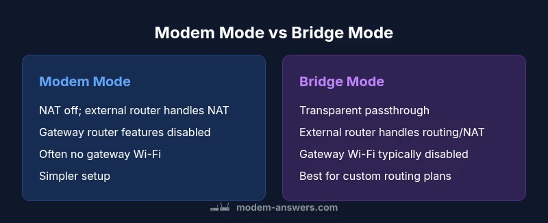 Is modem mode the same as bridge mode? Not exactly. According to Modem Answers, modem mode turns an ISP gateway into a pure modem by disabling the built‑in router, NAT, and often Wi‑Fi. Bridge mode, in contrast, leaves routing to your own router by passing traffic through the gateway with minimal processing. This distinction matters for networks with custom routing, firewall rules, or VPNs.