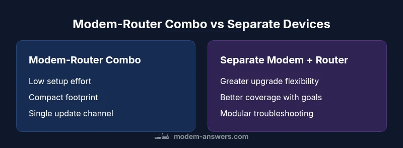 Separating the modem and router yields several practical benefits. You can upgrade the router to a newer Wi‑Fi standard without touching the modem, extend coverage with mesh systems or access points, and optimize placement for best signal. Modular setups also make it easier to troubleshoot: if wifi slows, you can swap out the router while keeping the same modem, or vice versa. Modem Answers emphasizes that this separation becomes particularly valuable as your internet plan increases in speed or as your home grows. A dedicated router often delivers stronger signal stability, better handling of multiple devices, and more advanced features for security, parental controls, and guest networks.