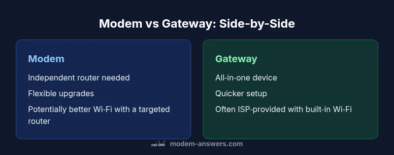 In the world of home networking, the distinction between a modem and a gateway matters more than ever. A modem is the bridge between your home and your Internet Service Provider (ISP). A gateway, on the other hand, is the all-in-one device that combines a modem with a router and often a built-in Wi‑Fi access point. Understanding this difference helps homeowners plan for future upgrades, security, and overall network performance. According to Modem Answers, the most common confusion stems from assuming all gateways are simply better than modems; the reality is nuanced and depends on how you use the device and what your ISP supports.