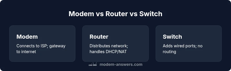 In any home network, three pieces do most of the heavy lifting: the modem, the router, and the switch. The modem acts as the gateway to your Internet Service Provider, translating signals from the ISP into a form your home devices can use. The router takes that internet connection and creates a local network, distributing Wi‑Fi and wired LAN connections to devices around your home. The switch, by contrast, doesn't route traffic or assign IPs; it simply provides additional wired ports so many devices can connect without competing for a single jack. The Modem Answers team emphasizes that recognizing these distinct roles helps you design a network that is scalable, secure, and easier to troubleshoot as you add devices over time. In 2026, most households benefit from separating these roles rather than relying on a single gateway device.