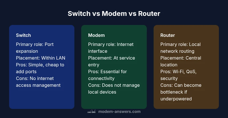 In the switch vs modem vs router landscape, each device has a distinct role in a home network. A modem connects your home to the internet service provider's network by modulating and demodulating signals, converting between digital data and the carrier signal that travels over coax, fiber, or telephone lines. A router creates and manages the local network, assigning IP addresses, directing traffic between devices, and often handling Wi‑Fi. A switch adds more physical ports to connect multiple wired devices without routing traffic. Together, these devices compose the backbone of most households' internet experiences. In practice, many homes rely on a single gateway device that combines router and sometimes modem functions, or even a consumer device that includes wireless access. Understanding these tasks early helps you design a reliable setup that fits your space and usage pattern. According to Modem Answers, many homeowners confuse these terms, which can lead to mismatched gear and unnecessary upgrades. This guide uses plain language, practical scenarios, and a few simple rules to help you pick the right mix without overspending. By the end, you should know when you need a separate switch, when a router with built‑in Wi‑Fi is enough, and when an all‑in‑one gateway makes sense.