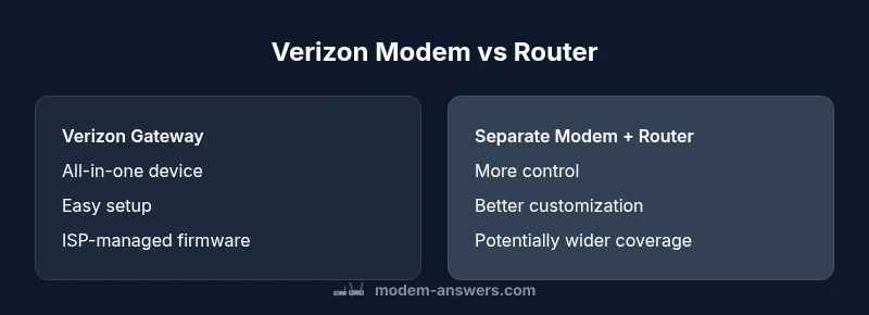 When you subscribe to Verizon home internet, you are often choosing between a gateway device that combines a modem and a router in a single box, or using your own modem with a separately managed router. In the ongoing comparison of verizon modem vs router, the practical difference comes down to where control sits: inside a single ISP-provided device, or distributed across two devices that you own and configure. For fiber service (FiOS), the optical network terminal (ONT) feeds a gateway that Verizon supplies, delivering both data termination and wireless distribution. For wireless home internet, the gateway may be a mobile router rather than a fixed unit, with built-in NAT and firewall settings. The gateway approach prioritizes simplicity and ISP support, while a two-device setup emphasizes flexibility, customization, and sometimes broader coverage in larger spaces. According to Modem Answers, the choice should align with your household topology, device count, and comfort level with network settings. This initial framing helps homeowners assess goals before diving deeper into specs and real-world results.