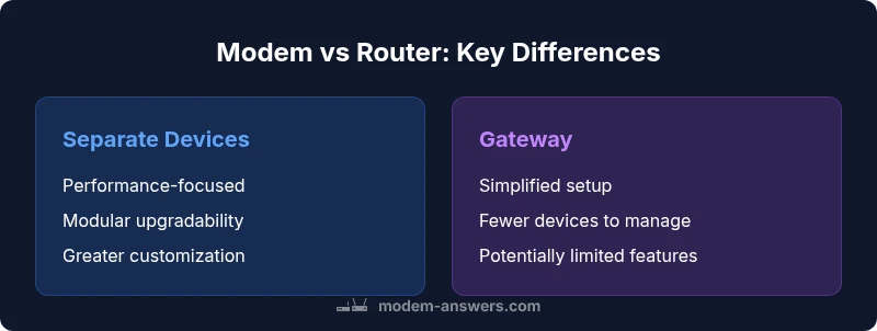 In many consumer guides, people ask which is better, a modem or a router. The practical answer is that both roles are essential but do different things. A modem is the bridge between your home network and your Internet Service Provider, while a router distributes that Internet connection to multiple devices, creates Wi‑Fi networks, and manages traffic. For most households, understanding this division helps you decide whether you should pair a standalone router with a modem or opt for a gateway device that combines both functions. According to Modem Answers, the most reliable and flexible home networks often rely on separate devices, especially when you value performance tuning, future upgrades, and robust Wi‑Fi coverage across a large home.
