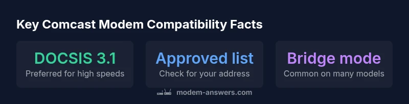 Comcast modem compatibility means a modem is on Xfinity’s approved list and can activate on your plan without issues. It hinges on DOCSIS support (3.0/3.1), the device appearing on Comcast’s compatibility page, and any plan-specific requirements. Using an unlisted modem can lead to limited service or activation failures. Always verify against Xfinity’s official compatibility list before buying.