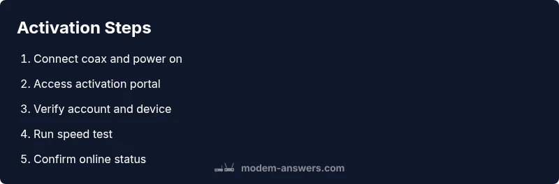 Activation is a sequence of five core phases: 1) connect and power on the modem; 2) associate the device with your Cox account; 3) verify the device information and service status; 4) test connectivity and speeds; 5) finalize the activation and secure your network. In practice, you will connect the modem to the coax line, power it up, and use a phone or computer to reach Cox’s activation portal or app. The system will detect the hardware, validate your account, and push configuration settings to the device. Successful activation results in an online status LED and a confirmed service status in your Cox dashboard. Modem Answers notes that the exact screens you see can vary by device model, but the underlying steps remain the same.