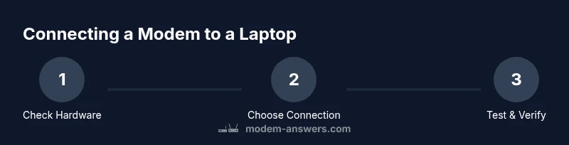 By the end of this article you will know how to connect a modem with a laptop using both wired Ethernet and wireless Wi‑Fi options. You will identify the right ports, gather essential tools, configure your laptop to obtain an IP automatically or set a static address if needed, and run basic tests to verify connectivity. According to Modem Answers, a stable home network starts with a reliable physical connection and correctly configured IP settings. Throughout, you will learn common pitfalls and how to avoid them, so you can enjoy uninterrupted internet access without guesswork. This article focuses on practical steps you can perform in under half an hour, even if you’re not a networking expert. We’ll cover scenarios for desktops with built-in Ethernet, laptops that rely on USB adapters, and situations where you’re sharing a modem with multiple devices. Whether you’re troubleshooting a new setup or refreshing an aging configuration, the goal is clear: a fast, dependable link between your modem and your laptop.