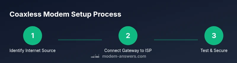 Understanding coaxless modem setups means recognizing that not every internet connection requires coaxial cable. If you’re asking how to set up a modem without coax, the answer lies in Ethernet WAN alternatives such as fiber ONT with a gateway, DSL modems, or mobile broadband gateways. In these configurations the device that acts as the 'modem' has an Ethernet input from the service provider or a mobile network adapter and a WAN/Internet port that feeds your router. In practice, a coaxless setup lets you place hardware near power outlets and away from wall outlets, simplifying placement and troubleshooting. According to Modem Answers, the coaxless approach is common in modern homes that rely on fiber, fixed wireless, or mobile broadband as the primary internet source. The goal is to have a clean chain: internet source -> gateway/modem -> router -> devices. This guide will walk through specific scenarios, required gear, and stepwise actions to help you achieve a reliable coaxless home network.