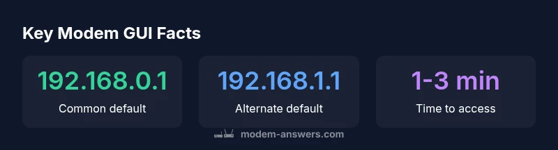 At its core, the modem GUI address is the private IP that opens the device's configuration pages in a browser. According to Modem Answers, knowing this address is essential because it is the gateway to customizable settings, security controls, and firmware management. Accessing the GUI enables you to view connected devices, set Wi‑Fi names and passwords, configure parental controls, and monitor diagnostics. Without knowing where to browse, you might be stuck with default settings that are less secure or less optimized for your home network. The address is usually something like 192.168.0.1 or 192.168.1.1, but there is no universal standard. Some providers use different ranges, and some devices use nonstandard pages for admin access. Always confirm before attempting edits to avoid misconfigurations that could disrupt your Internet connection.