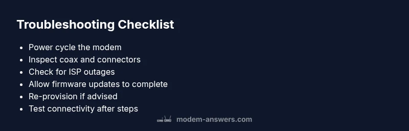 Start with the simplest remedy: power cycle the modem. Unplug the unit from power, wait 60 seconds, then plug it back in. While it reboots, verify the outlet is live and not controlled by a wall switch or surge protector that could cut power momentarily. Inspect the power adapter for damage and ensure the device isn’t placed on a rug or enclosed space that traps heat. During this stage, also confirm the coax cable is snug at both ends and that there are no visible kinks or pinches. If you notice damage or loose connections, replace or reseat the cable. These basic checks address the majority of blinking-green scenarios and align with community best practices shared by the Modem Answers team.