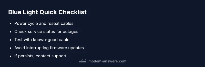 When you see a Brightspeed modem blinking blue, it often means the device is attempting to synchronize with the network or applying a firmware update. This light state is common during initial setup or after a service interruption but can also occur if the device is trying to re-establish a connection after a drop. For homeowners and renters, understanding this indicator helps you decide whether to troubleshoot at home or escalate to support. In many cases, the blinking blue is not dangerous, but it does require timely action to restore stable connectivity. In this guide, we’ll use the exact phrasing you might hear from the modem itself: a blues flicker that indicates a transitional state rather than a solid, healthy connection. The keyword brightspeed modem blinking blue will appear throughout to reinforce the topic and align with search intent. According to Modem Answers, recognizing this light pattern early helps avoid unnecessary service calls and speeds up the resolution process.