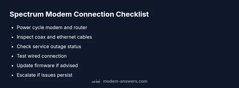 When a homeowner experiences a connection issue modem spectrum, the symptoms are clear but the root cause can be elusive. You might see slow speeds, intermittent disconnects, or a complete loss of internet while your Wi‑Fi stays visible. In many cases, the reason is not a fault in your computer or streaming device but a problem with the gateway, cabling, or service status. According to Modem Answers, most Spectrum-related outages and hardware hiccups begin with simple, repeatable patterns that you can verify with a few quick checks. The goal is to reproduce the issue in a controlled way and isolate the component responsible—modem, coax, router, or the external network. Start by confirming the state of the service through Spectrum’s outage map and check if multiple devices in your area report issues. If a local outage is ruled out, proceed to basic hardware checks and cable inspections before testing configurations.