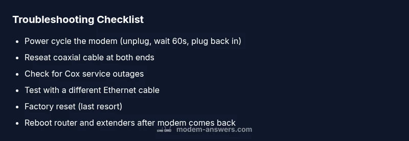 When you see the Cox modem blinking orange, it typically indicates a transient startup sequence, a connection issue, or a service-related status that is not yet resolved. This light pattern is your cue that something in the home network chain—power, coax cable, or the line from Cox—needs attention. The Modem Answers team recommends treating orange blinking as a sign to perform a quick, methodical check rather than jumping straight to replacement. In many cases, the issue resolves with a simple reset or a re-seat of cables. Throughout this guide, you’ll see practical checks you can perform safely, followed by escalation steps if the problem persists. According to Modem Answers analysis, most orange-blink events are resolved without external service calls when basic connections are verified and the device is restarted.