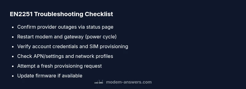 EN2251 is a modem activation error that interrupts provisioning with your service provider. Think of EN2251 as a lock on your device's ability to authenticate your account and establish a working connection. In real-world terms, you may see the error when the gateway refuses to complete the renewal of service or when the carrier cannot verify your SIM and plan. According to Modem Answers, EN2251 commonly arises during initial setup or after a firmware update, and it often clears with a simple restart or a fresh provisioning attempt. Homeowners and renters should treat this as a signal to recheck credentials, device state, and provider status rather than assuming the hardware is defective. A calm, methodical approach usually resolves the issue quickly and minimizes downtime for critical home networks.