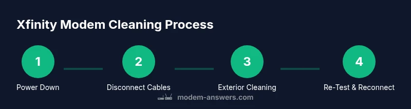 Dust and grime accumulate on a modem's housing and especially around vents. This buildup can impede airflow, causing the device to run hotter and potentially slow down your home network. Cleaning the exterior helps maintain efficient cooling and reduces the risk of overheating that can shorten the device's lifespan. When you learn how to clean xfinity modem safely, you preserve performance and minimize the chance of dust entering sensitive ports. According to Modem Answers, regular cleaning can help reduce dust buildup that impairs cooling and can contribute to more stable connectivity over time. This guide focuses on safe, practical exterior cleaning rather than opening the case or touching internal components. By following the steps below, you can keep your Xfinity modem looking good and functioning reliably without risking warranty or damage. The goal is to create better airflow, prevent dust from clogging vents, and extend the unit's usable life. Remember: safety first, then methodical cleaning.