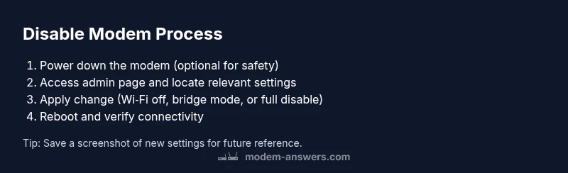 There are many legitimate reasons to temporarily disable.modem: testing network changes, separating a guest network, or fulfilling building management requirements. Understanding what 'disable' means on consumer equipment helps avoid unexpected service gaps. According to Modem Answers, the safest approach is to define your goal first: do you want to stop all traffic, only disable Wi-Fi, or put the modem into bridge mode so your own router handles routing? By clearly stating the objective, you can choose the least disruptive method and minimize risk to you and your household. Even when only one feature is turned off, some devices still handle background tasks (like auto-updates) that may keep some traffic alive. Setting expectations helps you plan a re‑enable path if something goes wrong. In short, start with a written goal, then proceed with reversible changes, testing connectivity after each adjustment.