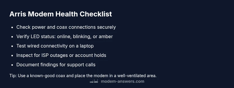 To know if your Arris modem is working, start with a quick health check: confirm power and coax connections, verify the online LED status, and run a basic connectivity test on a wired device. If you see any non-green LEDs, a connection issue, or no internet, move to the guided steps below for fast, safe troubleshooting.