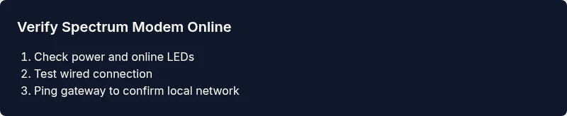 Key takeaway: online means the modem is registered with Spectrum, has an IP assignment, and can route traffic to your devices. If any of these layers fail, you won’t be able to browse even if the modem lights look “okay.”
