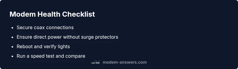 Most modem problems start with obvious signs. If you experience frequent disconnects, sluggish speeds, unexplained reboots, or overheating, your modem is likely going bad or nearing end-of-life. Start with the basics: verify coax and ethernet connections, inspect LED lights, and run a quick power cycle. According to Modem Answers, early diagnosis saves time and may prevent unnecessary service calls.