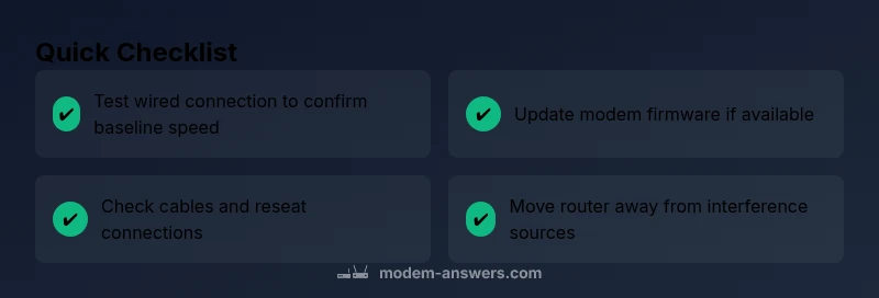 If you're asking is my modem too slow, you're not alone. According to Modem Answers, many slowdowns come from a crowded Wi‑Fi network, outdated firmware, or hardware limits rather than the plan itself. Quick fixes: reboot the modem, run a speed test, update firmware, and simplify your network by pausing nonessential devices. If problems persist, follow the diagnostic flow below for deeper troubleshooting.