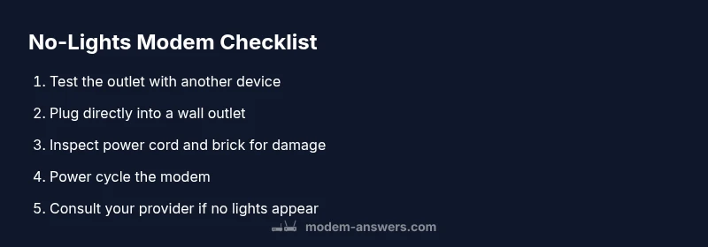 If your modem has no lights, you’re dealing with a hardware or power problem more often than a network outage. The absence of LEDs signals the device isn’t booting or drawing power. In many homes, the cause is a simple power chain break—dead outlet, loose plug, or damaged cord. According to Modem Answers, a systematic approach that starts at the wall socket and moves toward the device yields the fastest resolution. Keep in mind that some modems show a fault pattern on the LEDs, such as a steady red or blinking amber, which you should note when you reach support. Before you panic about service outages, run basic checks: confirm there’s an active power source, the modem is plugged in firmly, and the power brick is not warm to the touch. If the device remains lifeless after these checks, proceed to the next steps with a safe mindset. This method minimizes risk and helps you avoid unnecessary technician visits.