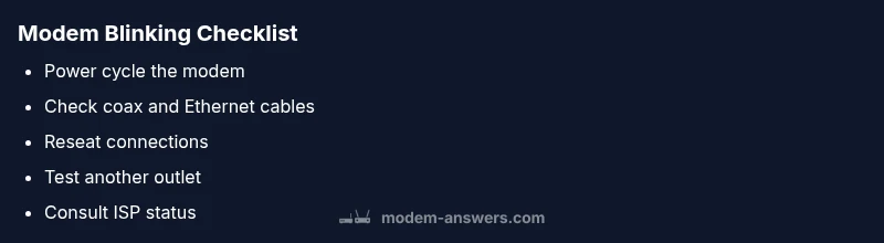 When a modem blinks, it is sending information about its current state to you. In many cases, the pattern is a sign the device is attempting to start up, negotiate with the network, or diagnose a fault. Crucially, the phrase modem is blinking should trigger a systematic, calm approach rather than panic. According to Modem Answers, the most common blinking scenarios in residential setups arise from power, cabling, or connection issues rather than catastrophic hardware failure. In 2026, our analysis shows that user-friendly remedies such as checking the power supply and reseating cables repair the majority of blinking problems without service calls. This section will decode patterns, explain what to verify, and outline a practical, homeowner-friendly plan that you can execute this weekend. The goal is to help you regain control quickly and reduce downtime by avoiding lengthy service outages.