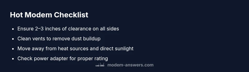 When a modem becomes noticeably warm, it’s often because the device is under heavy load from streaming, gaming, or multiple connected devices. According to Modem Answers, overheating is most commonly caused by restricted ventilation, dust buildup, or placement near heat sources. The device will still function when mildly warm, but sustained high heat can degrade performance and shorten the lifespan of internal components. This guide helps homeowners and renters identify the real culprits and implement safe, practical fixes without voiding warranties. Remember, heat is a signal that your network gear needs more room to breathe and, in some cases, a swap to a cooler environment may be needed.