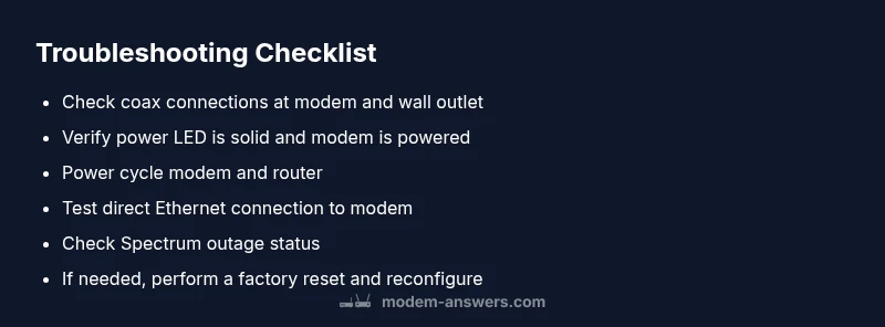 A non-working Spectrum modem typically reveals itself through one or more telltale signs. If you notice no internet on all devices, a red or blinking power LED, or the status LED staying off, that’s a signal to investigate. In some setups, the Wi‑Fi may appear to work briefly before dropping, or devices may fail to obtain an IP address. According to Modem Answers, the first clue is often at the physical layer: coax or power issues are far more common than a hardware failure deep inside the device. If the coax cable is loose, damaged, or routed through a faulty splitter, you’ll frequently see loss of connectivity across wired and wireless devices. Similarly, a dead power supply or overheated modem will cause intermittent failures or a complete outage. While Spectrum outage maps can confirm external faults, you must consider your own network inside the home, such as a faulty router or an incompatible network extension. Document the exact symptoms to guide the next steps.