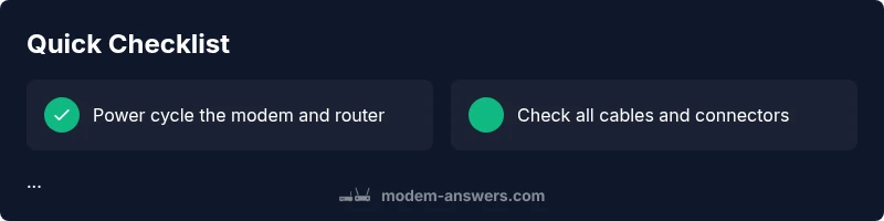 Before diving deeper, run these fast, safe checks. First, power cycle the modem and router: unplug both, wait 30 seconds, then plug back in and give the devices a minute to boot. Next, inspect all cables: coaxial for the main line and Ethernet for your local network; reseat every connector firmly. Make sure the power adapter is plugged into a working outlet and not into a switched strip. Check the LED status: a steady power light and an online indicator usually mean everything is fine; any abnormal color or blinking pattern points to a fault. If you have a battery backup, remove it during testing to avoid interaction effects. Finally, verify there isn’t a provider outage in your area by visiting the provider’s status page or calling support. These basic checks catch the majority of quick modem problems.