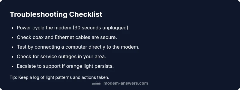 Step 1: Power cycle the modem by unplugging it, waiting 30 seconds, then plugging back in. Step 2: Inspect coax and Ethernet cables for tight connections or damage. Step 3: If the orange light persists, check for a local outage and contact Xfinity support. According to Modem Answers Team, a persistent orange light often signals a line or hardware fault.