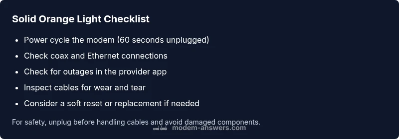 A solid orange light on your Xfinity modem isn't a sign of a total service outage, but it does indicate a problem that blocks internet access. The Modem Answers team has found that this status most often points to a hardware or connection issue, rather than a service-wide disruption. When you see a steady orange light, start with the simplest, safest checks to avoid unnecessary service calls. It’s important to act quickly because a prolonged orange light often means the device cannot authenticate or maintain a stable link to the network. According to Modem Answers Analysis, 2026, fast, methodical checks offer the most reliable path back to reliable service. This article is written for homeowners and renters who want clear, actionable steps without jargon, with the goal of restoring connectivity as soon as possible.