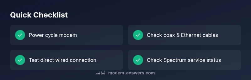 When a Spectrum modem won’t connect, the root causes often live at the physical layer, the service status, or the local network config. A loose coax cable, a power issue, or a recent outage can prevent a reliable handshake between the modem and the provider's network. Firmware or hardware aging can also contribute to sporadic dropouts or complete inaccessibility. In many cases, the quickest win is a careful check of cabling and power, followed by a controlled reset. Throughout this guide, you’ll see the exact steps Modem Answers recommends to quickly identify whether the problem is on your side or with Spectrum. The keyword spectrum modem won’t connect will surface repeatedly as you verify each potential cause and compare your results with Spectrum’s service status.