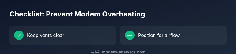 Start with the simplest fixes first. Gently relocate the modem away from walls or cabinets to improve air circulation and ensure there is at least several inches of clearance on all sides. Unplug the unit, inspect vents for dust, and carefully remove debris with a soft brush or compressed air if available. Replug and power up, then monitor temperatures during typical usage. If the device continues to feel hot or you observe reboot cycles, reduce the workload by limiting simultaneous devices or allocating bandwidth through QoS settings. Avoid stacking other heat‑generating electronics on top of the modem. Keeping the room cool, using a fan, and avoiding direct sunlight will help maintain reasonable operating temperatures. The Modem Answers team emphasizes that quick, calm action now prevents longer downtimes and potential warranty concerns.