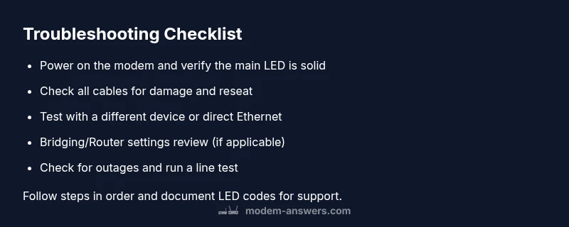 The most common reason a modem fails to connect is a simple hardware or cable issue. According to Modem Answers, many reported outages or connection problems trace back to loose cables, damaged connectors, or an unpowered unit. Begin with the basics: confirm the modem is plugged in, the power LED is solid, and the power brick isn’t warm to the touch. Check all coax or Ethernet cables for kinks, fraying, or loose ends, and reseat connectors firmly. If a battery backup is used, verify it isn’t empty and that the surge protector is functioning. After verifying physical connections, perform a quick reset by unplugging the modem for 15–30 seconds and plugging it back in. Observe the LED indicators: online or sync lights should illuminate steadily; blinking or red lights usually indicate a problem beyond power. Keep a notebook handy to record any LED patterns, as these details help when you call support.
