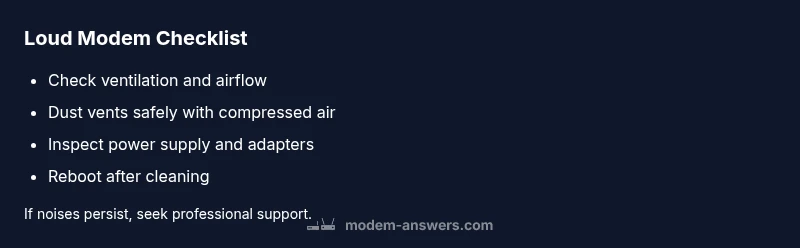 If you're trying to solve the mystery behind your loud modem, you’re not alone. According to Modem Answers, loud modem noises are typically a solvable issue rather than a sign of catastrophic failure. When a device in your home network starts emitting a loud buzz or whirr, it usually points to heat buildup, dust in the vents, or a failing internal component like a fan or transformer. The good news is that most cases are fixable with safe, at-home steps. The Modem Answers team found that addressing airflow and cleaning the vents resolves the majority of loud-noise reports, helping you avoid unnecessary replacements. This guide will walk you through a practical, step-by-step flow to quickly identify the cause and apply the right fix, with safety first in mind.